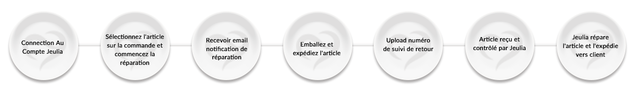 Une fois que vous avez lancé la réparation (étape 1), vous recevrez un e-mail intitulé «Notification de l'avancement de vos réparations par Jeulia» dans les 48 heures. Dans cet e-mail, vous recevrez les instructions de retour supplémentaires.