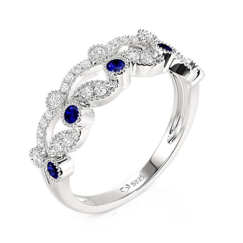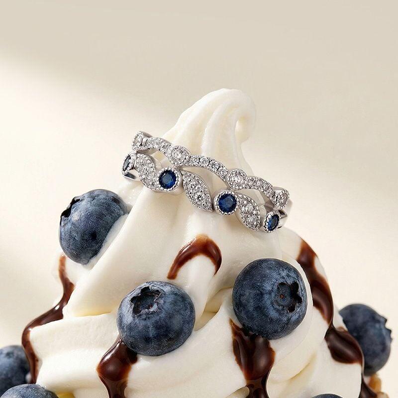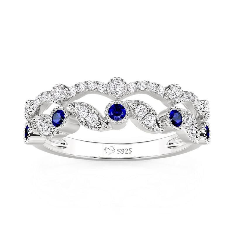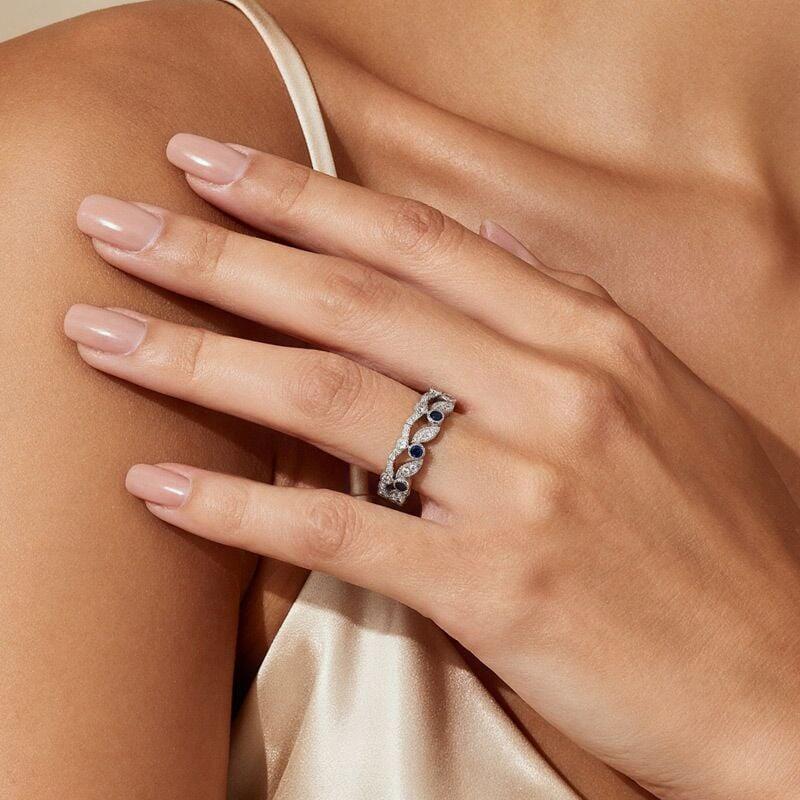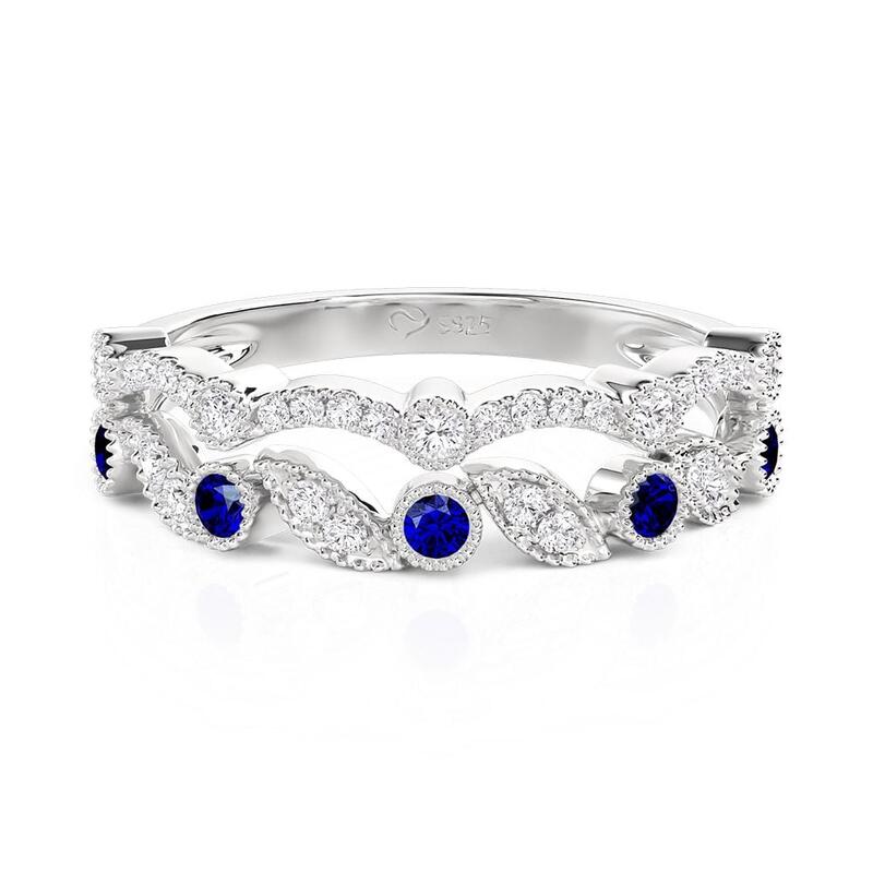 Deux bandes jumelles fusionnent en une rangée continue de pierres alternées bleues et blanches, leurs courbes en forme de feuilles s'écoulant comme des vignes entrelacées. La lumière joue sur le bleu frais et le blanc brillant dans un rythme silencieux. Cette bague de mariage empilable double rangée Jeulia célèbre l'union de deux êtres, chaque couleur restant distincte, ensemble lumineuse.
