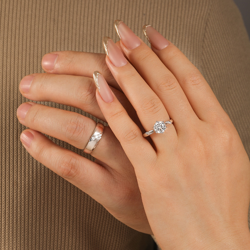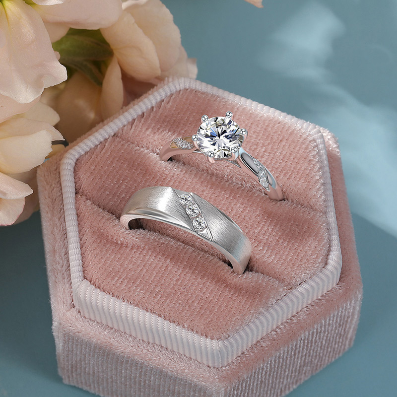 Une paire d'élégantes bagues de couple personnalisées avec un design torsadé étincelant. L'élégance simple de la bague pour homme, sertie de plusieurs petites pierres, symbolise le dévouement et la loyauté de l'homme envers la relation. La bague de fiançailles élégante pour femme présente une pierre centrale scintillante, flanquée de pierres plus petites dans un design torsadé. La fusion des deux bagues de couple capture l'ensemble du dévouement du couple à l'amour - concentration, loyauté, dévouement et désir. Cette paire de bagues de couple personnalisées représente l'union de deux vies qui se soutiennent mutuellement et grandissent ensemble. C'est un témoignage du voyage du couple vers un mariage heureux et éternel.