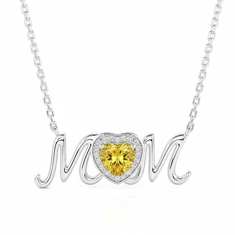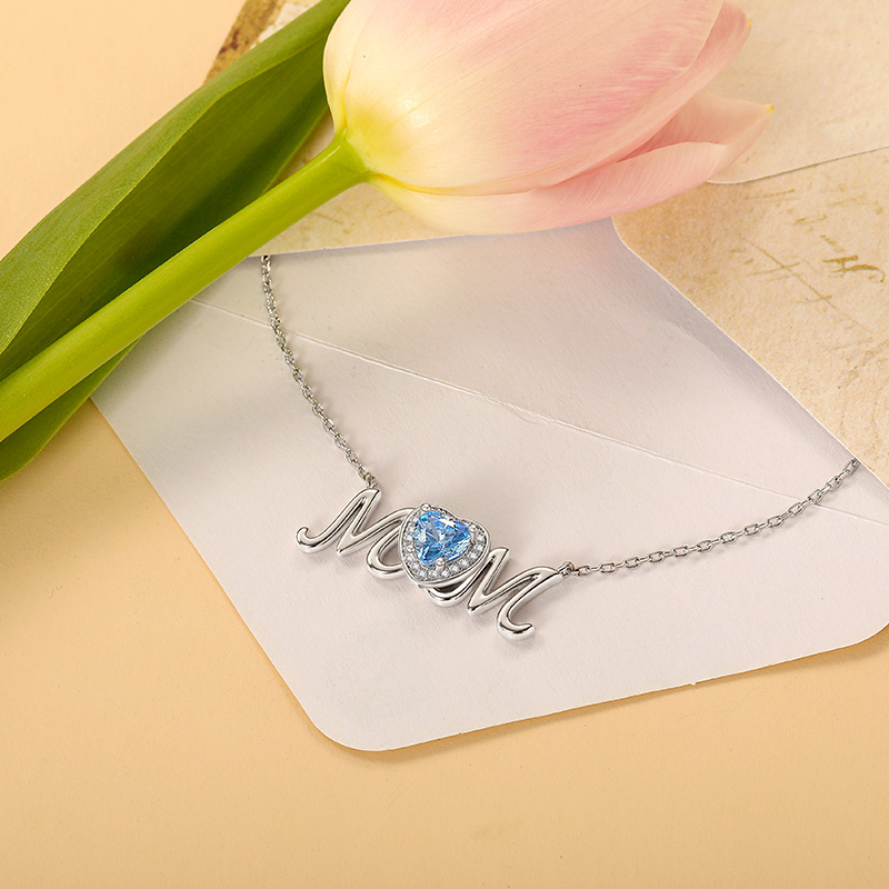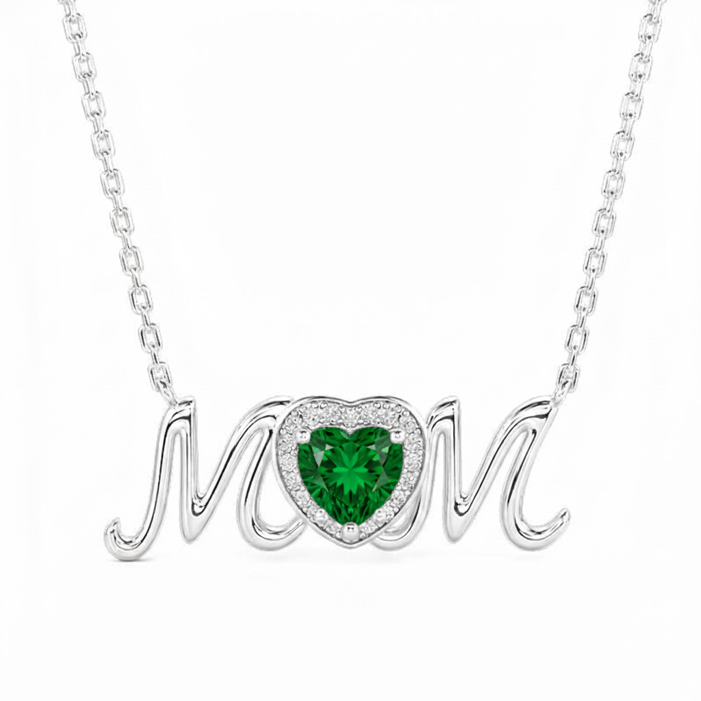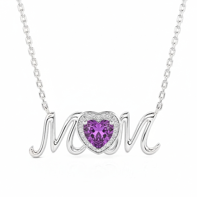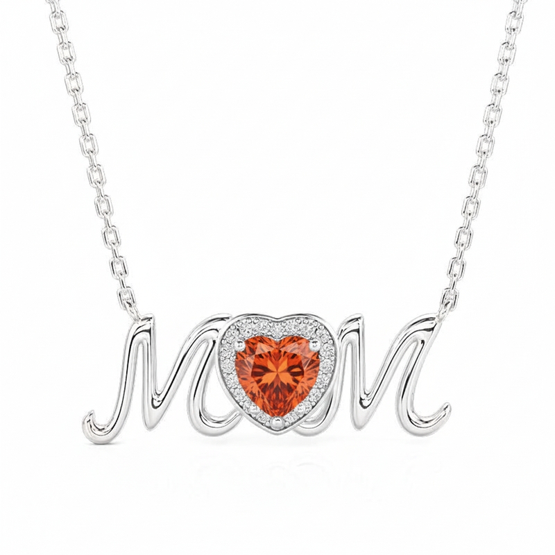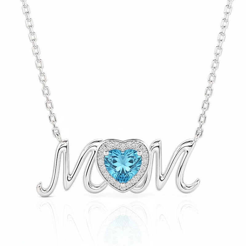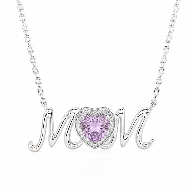 Ce collier personnalisé "MOM" à cœur et pierre de naissance — une tendre algèbre : la pierre de naissance en forme de cœur remplace le "O", sa couleur choisie parmi celle de votre mois de naissance ou sa nuance préférée. Suspendu à une chaîne délicate, les lettres s'arrondissent comme son écriture sur les notes de boîte à lunch, la pierre capturant la lumière sous des angles qui imitent son rire — doux, chaud, inébranlable. Pour la femme qui vous a appris que « mère » est à la fois un nom et un verbe.