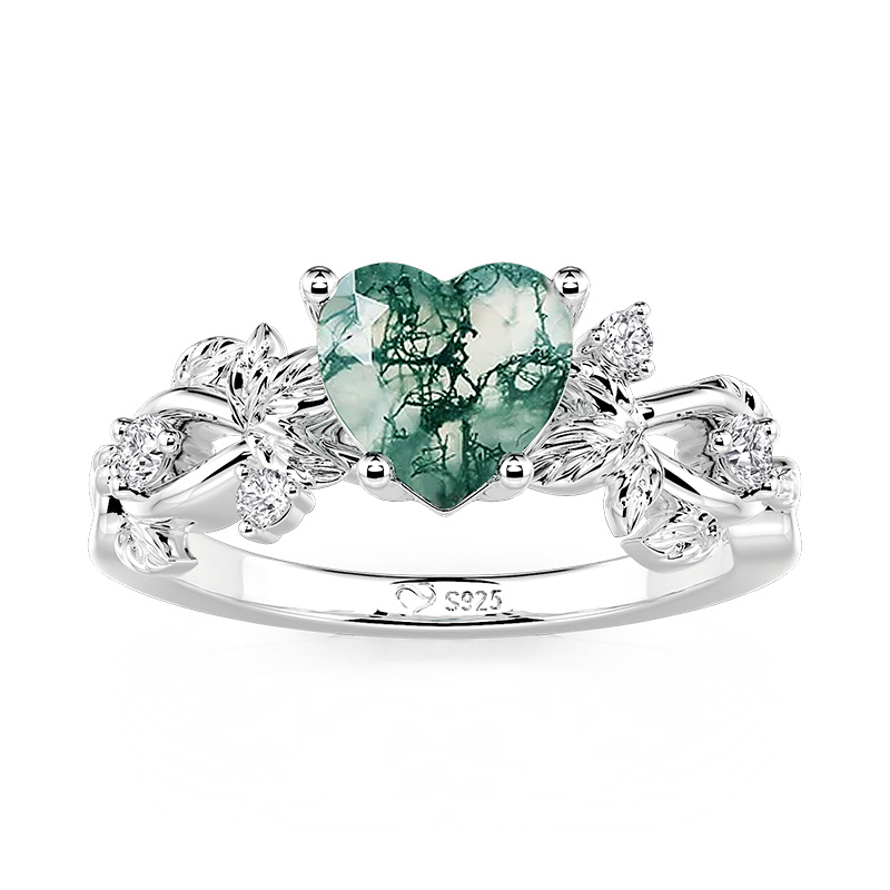 Alliez charme terre-à-terre et symbolisme romantique dans la bague de fiançailles agate mousse cœur infinity torsadée feuille-vigne Jeulia. Cette bague unique présente une agate mousse centrale en coupe cœur, associée à des détails de band qui tissent symboles d'infini et éléments de feuille-vigne (ornés d'accents chatoyants). Cette bague à feuilles est un emblème inspiré de la nature, une alchimie de beauté organique et de symbolisme d'amour intemporel — idéale pour des fiançailles significatives.