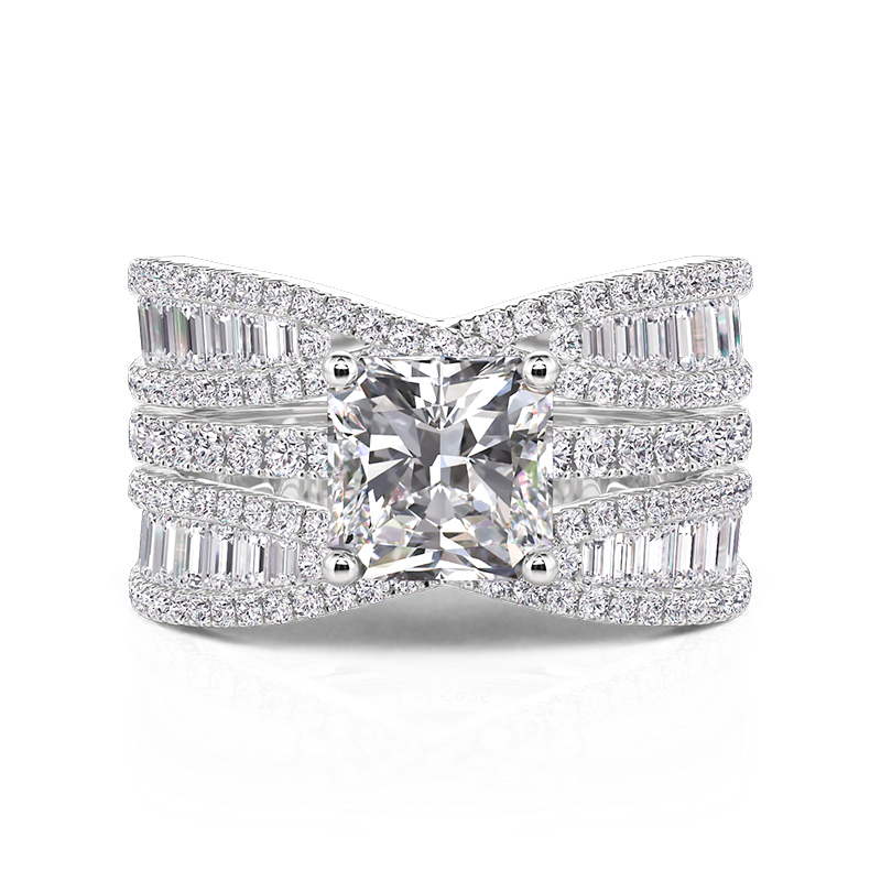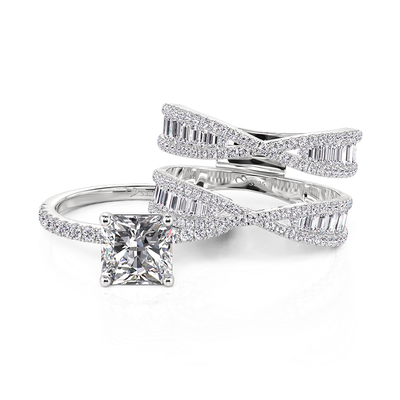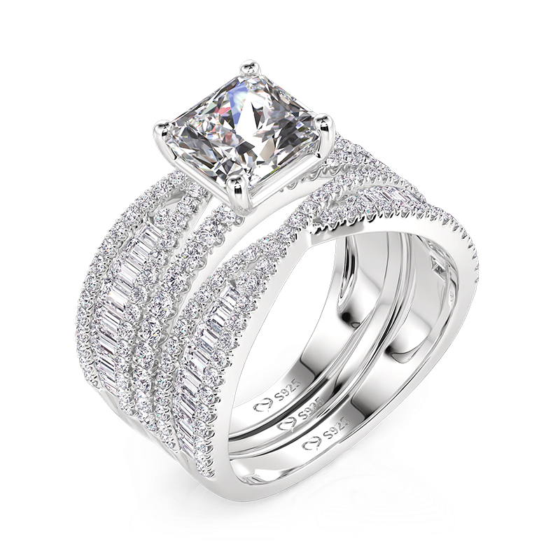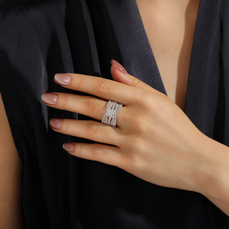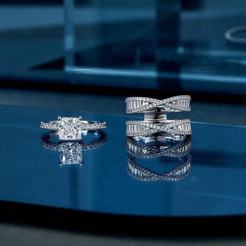 Un anneau solitaire à taille princesse rencontre des accents de double nœud papillon dans cet ensemble d'anneaux puzzle interlocking 2PCS——la précision de la géométrie adoucie par un détail pavé dentelle. Les facettes aiguës de la bague principale projettent une lumière prismatique, tandis que la bague emboîtée l'enveloppe dans une ruban céleste, ses micro-pierres scintillent comme de la poussière d'étoiles capturées en plein tourbillon. Portez-les empilés pour une grandeur galas-prête, ou séparez-les : la solitaire se dresse audacieuse comme un sonnet solitaire, les nœuds papillon murmurent un haïku. Gravez des coordonnées le long de la courbe interne, un chiffre que seul vos doigts tracent lorsque vous alignez les pièces, car l'amour prospère en couches — parfois armure, parfois déboutonné.