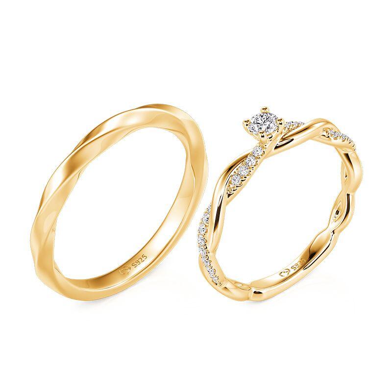 This gold matching couple ring set from Jeulia unites minimalist elegance with romantic symbolism. The women’s wedding ring features a twisted band with a brilliant round-cut stone embraced by pavé accents, while the men’s ring offers a bold textured twist design for subtle light play. Crafted from sterling silver with a warm gold finish, both rings offer lasting comfort and shine. Ideal for engagements, anniversaries, or as a meaningful commitment gift.