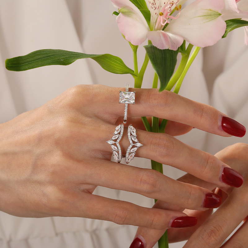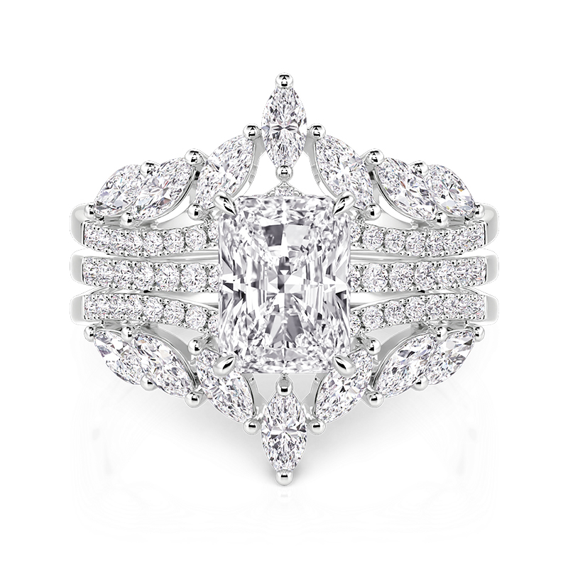 Une pierre centrale à coupe radieuse brille dans un activateur en forme de couronne, où des gemmes marquise et rondes rayonnent comme des rayons cérémoniels. Empilez les pièces pour construire un spectacle de symétrie et de feu, ou portez l'activateur seul comme un halo royal. Le jeu de bagues Jeulia Olivetta Symmetry Radiant Cut Enhancer est idéal pour les moments qui appellent un éclat qui parle avant vous.