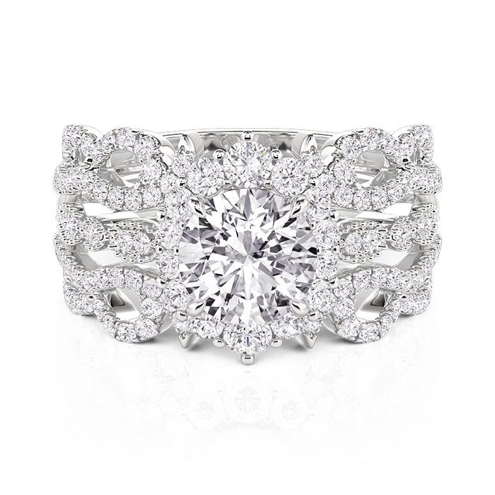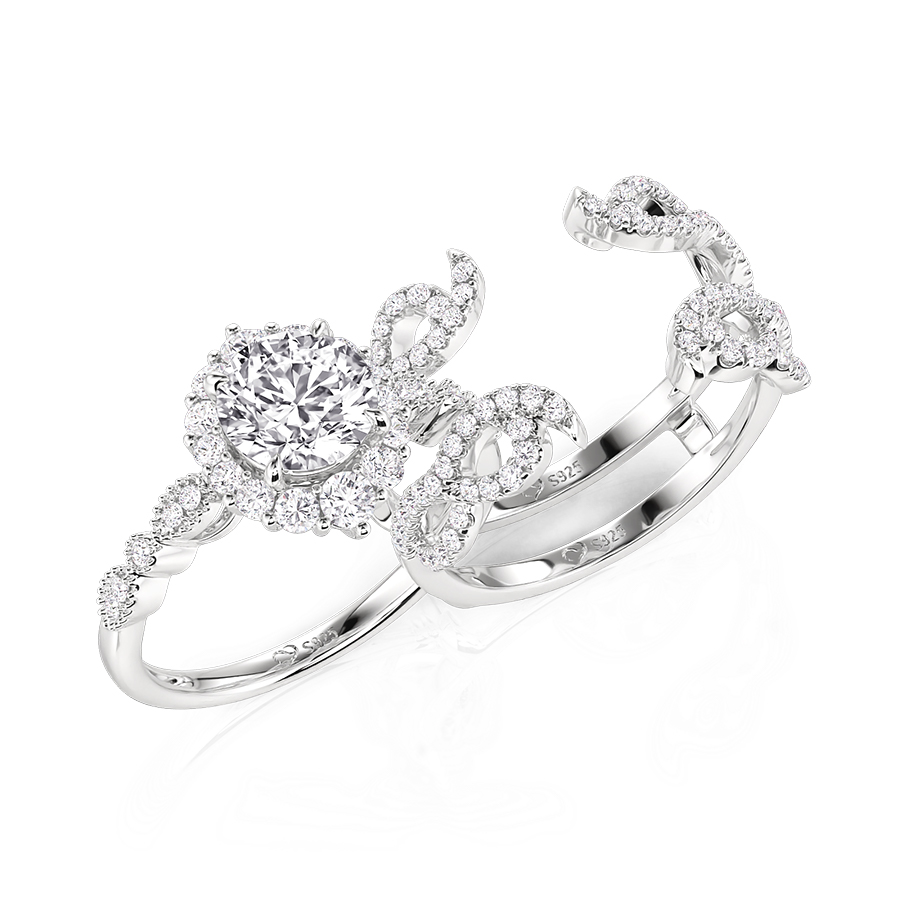 La bague de fiançailles Jeulia Round Halo avec set Butterfly Enhancer présente une gemme centrale ronde qui brille au sein d'un halo de pierres pavé, tandis que l'enhancer se déploie en ailes de papillon abstraites ornées de cristaux dispersés. Appariés, ils créent un équilibre délicat entre géométrie et grâce—la lumière capturant à la fois l'aile et la pierre, comme si la nature elle-même approuvait cette union.