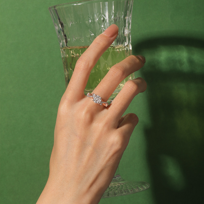 Cette bague de fiançailles Jeulia Twistd Vine Two-Tone Round Cut présente des brins d'or rose et d'argent s'entrelaçant comme des vignes enlacées, qui bercent une pierre centrale ronde au milieu de gemmes pavé éparpillées qui scintillent comme la rosée du matin. Les métaux chauds et froids dansent en rythme sans couture—un symbole de deux âmes entrelacées mais distinctes, conçue pour des unions enracinées dans la passion et la grâce.
